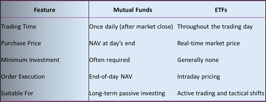 • Unlike mutual funds, which are priced daily, ETFs can be traded anytime during market hours.