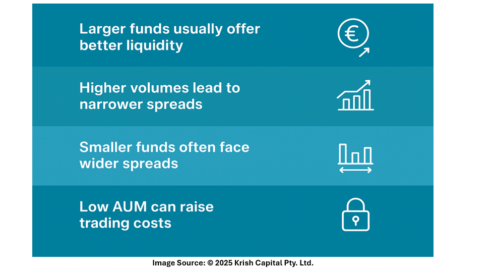 Liquidity refers to how easily a fund’s units can be bought or sold without affecting the market price. In general, larger funds tend to have better liquidity. This is because they usually attract higher trading volumes, narrower bid-ask spreads, and a deeper pool of buyers and sellers. With smaller spreads, the price difference between buying and selling narrows, reducing the trading cost for the participant.