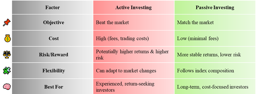 - Active investing aims to beat the market using research-driven strategies.