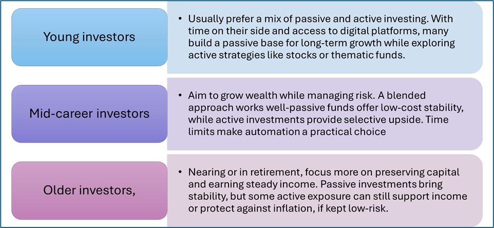 - Many investors today prefer a blended (core-satellite) approach for balance.
