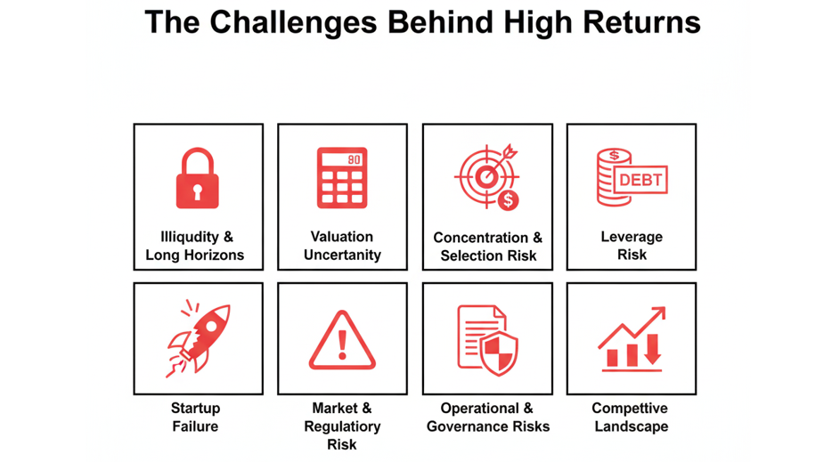 - Illiquidity and Long Horizons: PE and VC investments are typically locked in for 8–12 years or more, limiting early exit options.