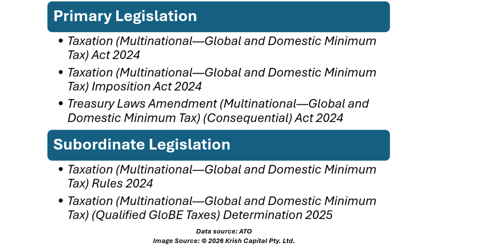 Australia’s global and domestic minimum tax is implemented through the following legislation, collectively referred to as the Minimum Tax law.