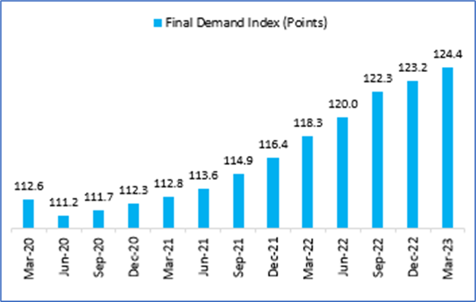 As per the data shared by the Australian Bureau of Statistics on 28 April 2023, the final demand (excluding exports) stood at 124.4 for the January-March quarter of 2023. It registered 1% sequential growth, but on an annual basis, it was higher by 5.2%.