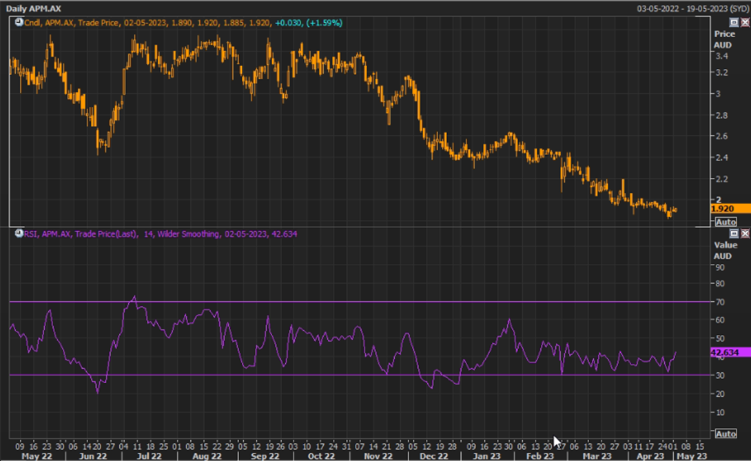 As of 10:45 am AEST on Tuesday, 2 May 2023, APM shares were up by 1.59% to trade at AUD 1.920 per share. In the last one month, the stock has fallen by nearly 3.52%. APM shares are nearly 46% away from their 52-week high of AUD 3.550 seen on 22 August 2022. Last month on 27 April, the stock hits its 52-week low of AUD 1.825, and as of now the stock is 5.21% higher than its 52-week low level.