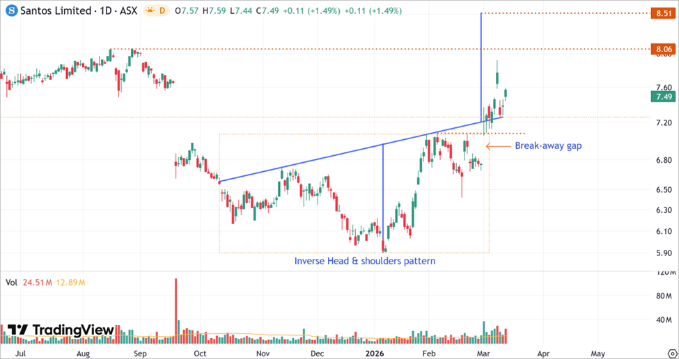The ASX Energy sector remains the market's primary beneficiary of escalating geopolitical tensions and rebounding oil prices, which are currently retesting the US$100/barrel level. Leading the charge, Ampol (ASX:ALD), Santos (ASX:STO), Viva (ASX:VEA), and Woodside (ASX:WDS) have all pushed deep into the Leading quadrant of the momentum chart. While STO and WDS have already completed bullish inverse head and shoulders breakouts, ALD and VEA are currently developing setups of their own. Despite facing immediate resistance at key historical peaks, the sector's overall upward momentum remains intact, with established price targets suggesting significant further upside if current breakouts are sustained.