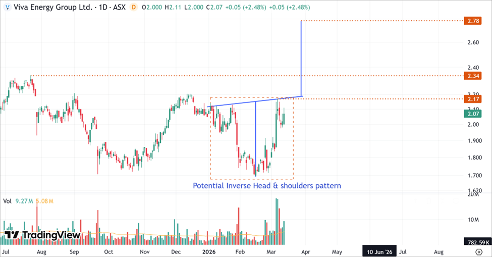 - Viva Energy (VEA) is currently forming a potential inverse head and shoulders technical setup that has been developing since December 2025. A clear move above the $2.20 resistance level (the pattern’s neckline) would signal a breakout, potentially driving the share price toward a target of $2.75. Investors should watch for possible price consolidation or pullbacks near $2.34, a key resistance level formed by the July 2025 peak.