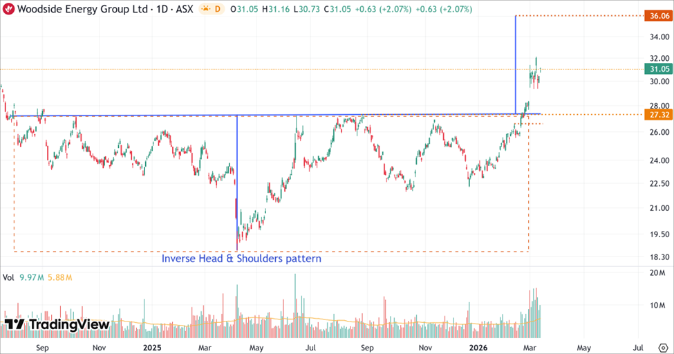 - After breaking out of its inverse head and shoulders pattern, WDS’s stock price formed a rising window, suggesting that bullish momentum remains strong. While currently in a brief consolidation phase, the price is likely to head higher toward the projected target of $36.06.