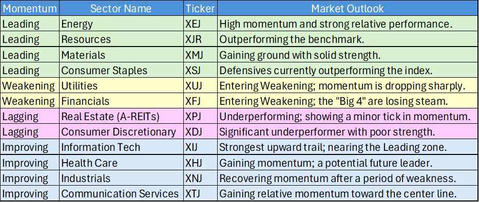 - XFJ (Financials): The Financials sector is right on the cusp of the horizontal "momentum" line. Its downward trajectory is steady, indicating that the heavyweights (like the Big Four banks) are losing the momentum that previously drove the index higher.