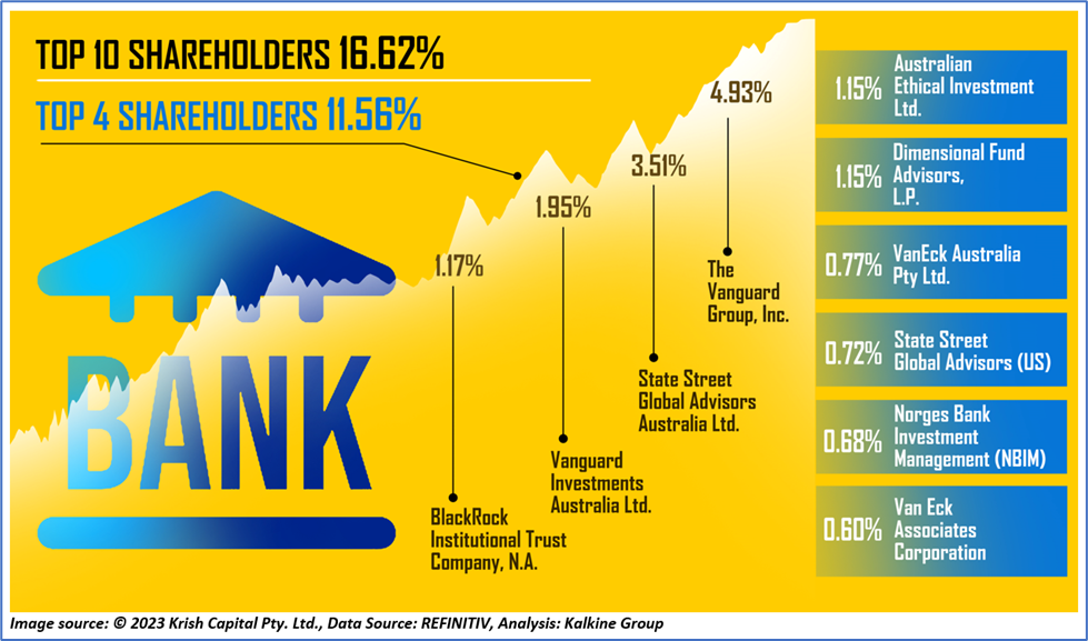 The top 10 shareholders of BOQ together hold around 16.62% stake in the company, and the top four shareholders together have 11.56% stake. The Vanguard Group, Inc. and State Street Global Advisors Australia Ltd. have the maximum stake in BOQ, with holdings of around 4.93% and 3.51%, respectively.
