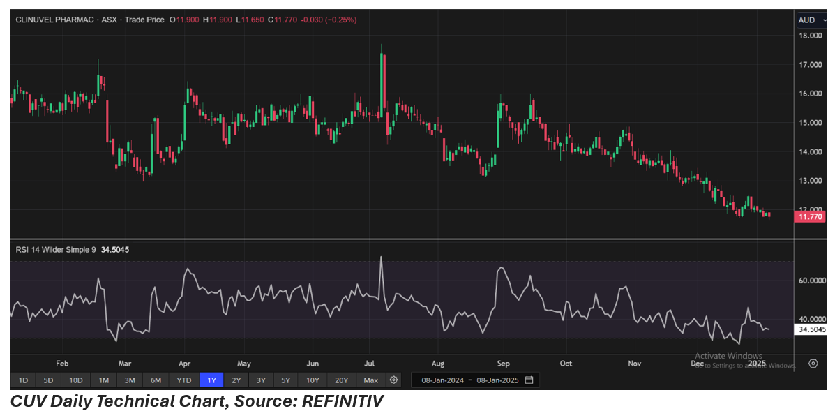 CUV has reported strategic advancements in the financial year 2024. Driven by strong demand for SCENESSE® (afamelanotide), CUV achieved a 15% YoY growth in total revenues, reaching AUD 95.31 million compared to AUD 82.99 million in FY23. In FY24, net profit before tax also rose by 11% YoY, amounting to AUD 50.68 million, while basic earnings per share (EPS) increased by 15% YoY, reaching AUD 0.72.