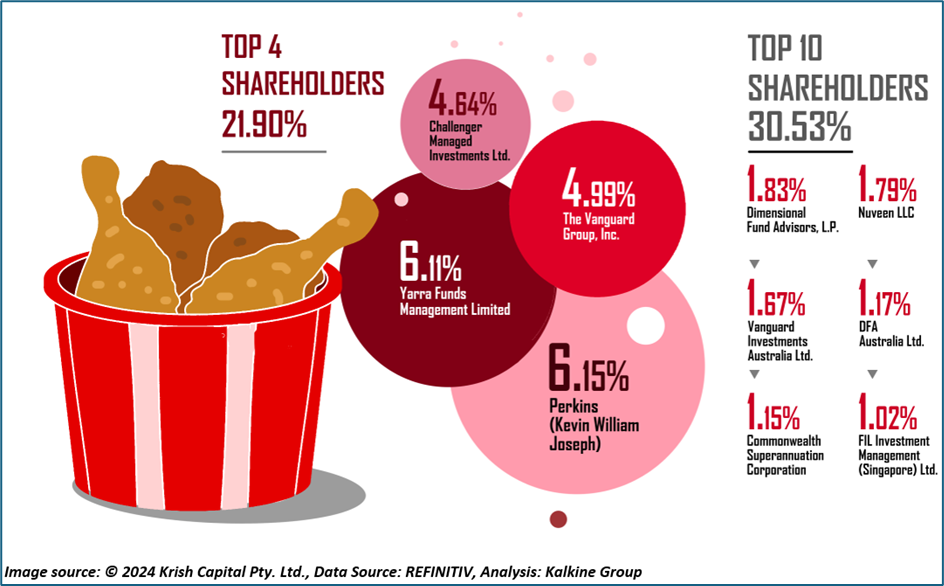 Top 10 shareholders of CKF have around 30.53% shareholding in the firm, while top four have 21.90% of the shareholding. The highest stake in the firm is held by Perkins (Kevin Williams Joseph) with a shareholding of 6.15%, followed by Yarra Funds Management Limited with a shareholding of 6.11%.