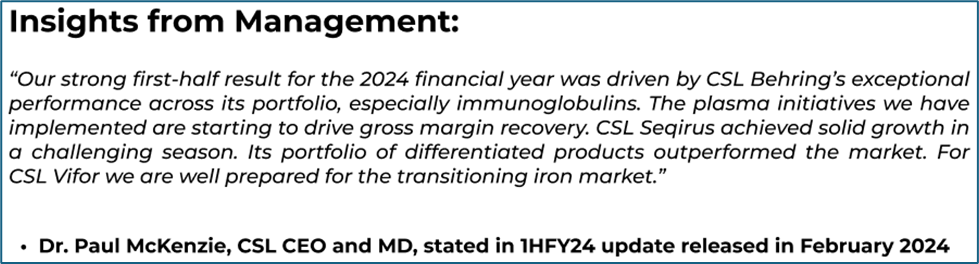 Performance during the six months ended 31 December 2023 was underpinned by portfolio growth of CSL Behring, which registered 23% increase in sales of immunoglobulin products. Driven by international plasma supply, and increase in patient demand, positive performance was witnessed across all geographical regions.