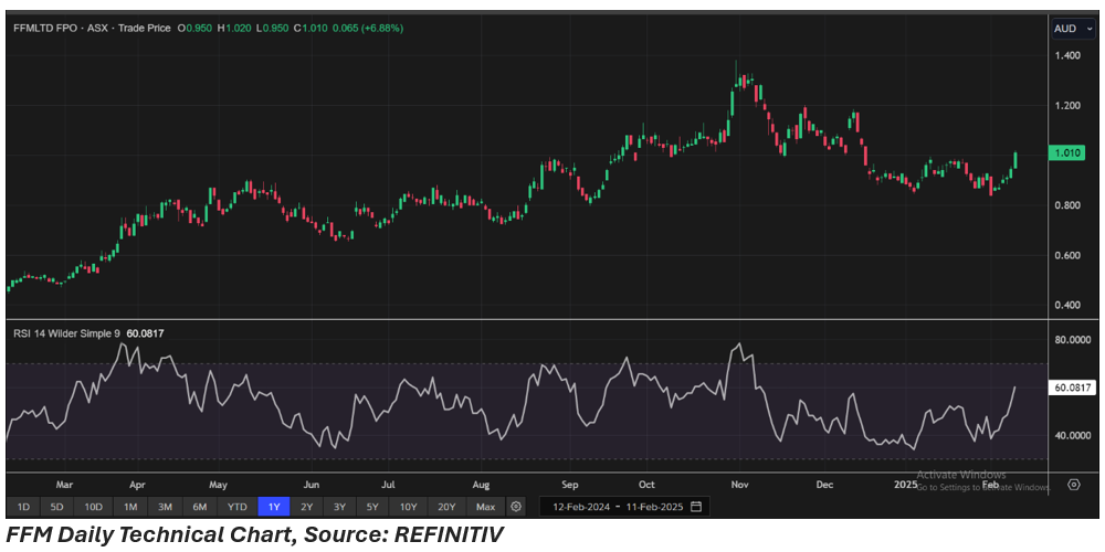 FFM shares closed 6.88% higher at AUD 1.01 per share on 11 February 2025. Over the past six months, the share price of FFM has increased by nearly 30%, and in the last three months, it has dropped by approximately 11.79%.