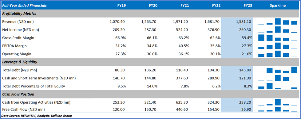 However, in FY23, the total operating revenue dropped by 6% to NZD 1,581.1 million and net profit after tax dropped by 34% YoY to NZD 250.3 million.