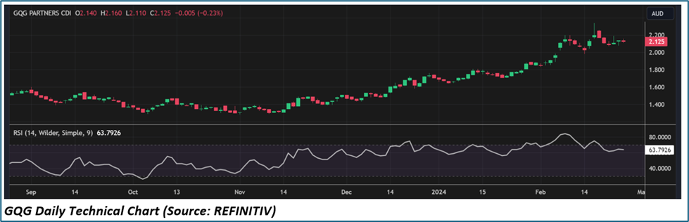 GQG shares closed 0.938% higher at AUD 2.15 apiece on 26 February 2024. Including today’s gain, GQG share price has increased by almost 47.26% in the last 12 months and has surged by nearly 15% in the last one month.