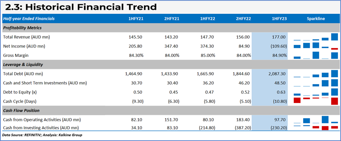 For the half-year ending 31 December 2022, the company reported revenues of AUD 181.7 million, 20.2% higher than the revenue of AUD 151.2 million reported for 1HFY21. Strategic investments and accretive acquisitions supported the company's revenue growth. During 1HFY23, the company's net property income (NPI) rose 19% annually, while like-for-like NPI gained 10.8% over the prior corresponding period (pcp).