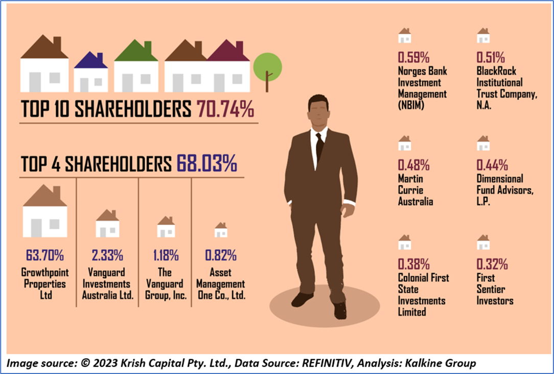The top 10 shareholders of the company together hold nearly 70.74% of the total shareholding in the company. Growthpoint Properties Ltd and Vanguard Investments Australia Ltd. hold a maximum stake in the company at 63.7% and 2.33%, respectively. Here are the other large shareholders in the company: