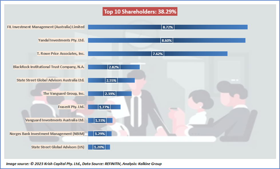 The top 10 shareholders of IGO have around 38.29% shareholding in the company. Investment Management (Australia) Limited and Yandal Investments Pty. Ltd. have the highest stake in the firm, with a shareholding of ~8.72% and ~8.60%, respectively.