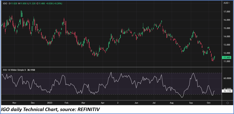 IGO shares closed 0.26% up at AUD 11.46 apiece on 11 October 2023. With this, in the past one year, IGO’s share price has dropped by 25.56% and has fallen by 24.74% in the last three months.