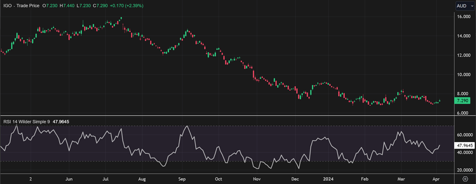 IGO shares closed 2.39% higher at AUD 7.29 apiece on 4 April 2024. Over the last 12 months, IGO’s share price has declined by 40.54%, and in the last three months, it recorded a dip of 16.11%.