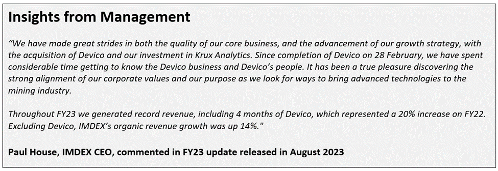 In the financial year 2023, the company delivered a record revenue of AUD 411.4 million, 20.4% higher than the previous year. Itse group revenue includes 4-month contribution made by acquired entity – Devico. IMD also made a 40% strategic investment in Krux Analytics during the reported year.