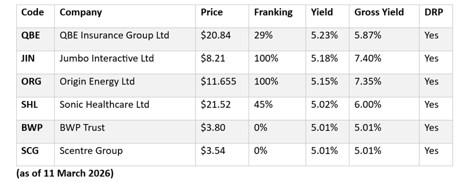 - Six ASX-listed companies across insurance, energy, healthcare, property, and digital gaming currently offer dividend yields around or above 5%.