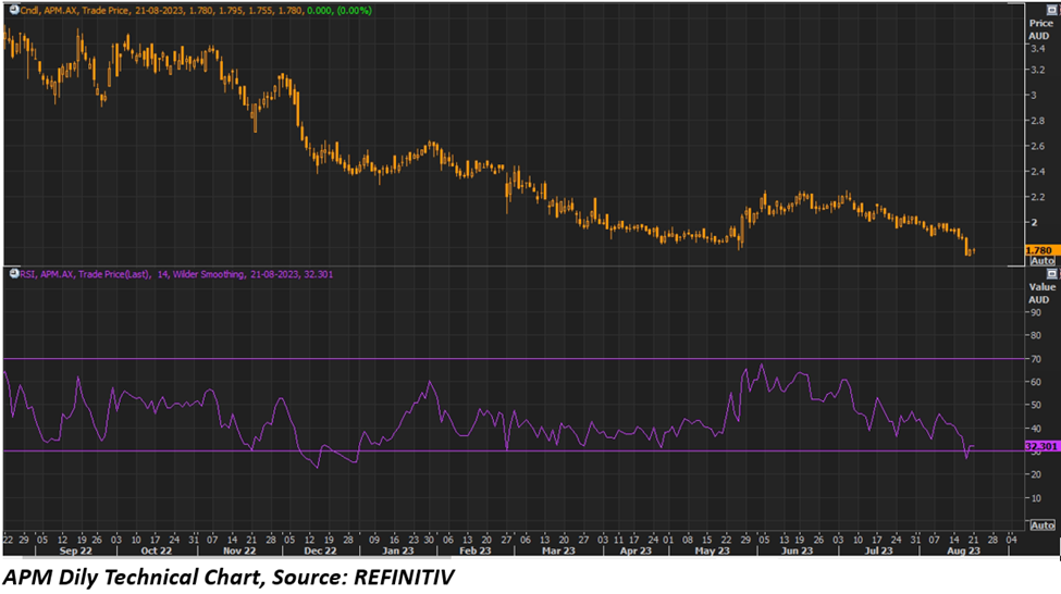 APM shares closed flat at AUD 1.78 apiece on 21 August 2023. In the last one year, the APM shares witnessed a drop of 48.4% and on a year-to-date basis, the share price has declined by 25.21%.