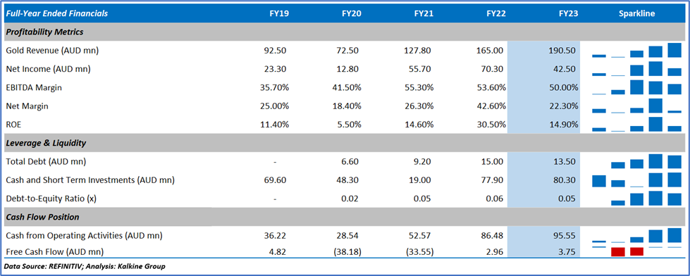 The AUD 337.92 million-marketcap firm reported 15.5% YoY surge in its gold revenue to AUD 190.5 million and 5.2% YoY rise in gold production to 70,253 ounces in the financial year FY23. During the reported period, cash and cash equivalent stood at AUD 80.3 million.