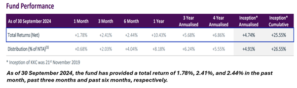 - KKC delivered a 1.78% return in September 2024
