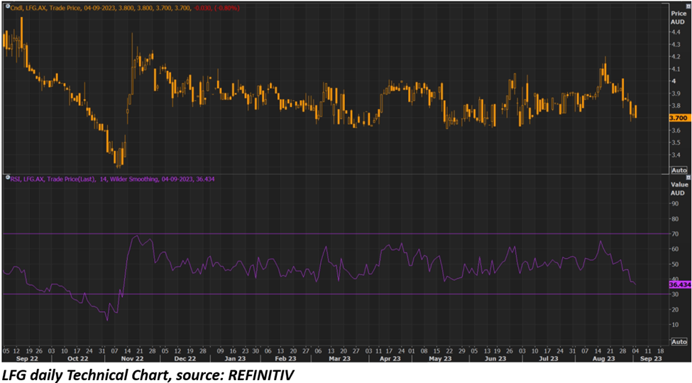 LFG shares closed 0.80% lower at AUD 3.7 apiece on 4 September 2023 with a market cap of AUD 1.13 billion. Including this, the stock registered a fall of 15.9% in the last 12 months and recorded a fall of 7.27% on a year-to-date basis.