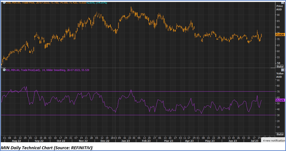 MIN shares closed at AUD 73.820 per share, 4.05% higher than the previous close on 25 July 2023. Including today’s gain, the share price has increased by 49.99% in the past 12 months and recorded a fall of 21.63% in the last six months.