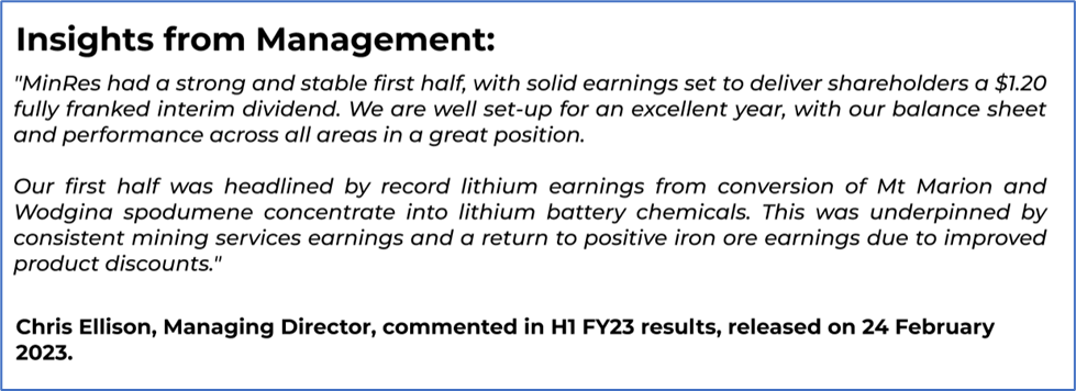 MinRes announces dividends on a semi-annual basis. The company had declared an interim dividend of AUD 1.20 apiece with an ex-date of 9 March 2023 and a pay date of 30 March 2023. The distribution was 100% franked.