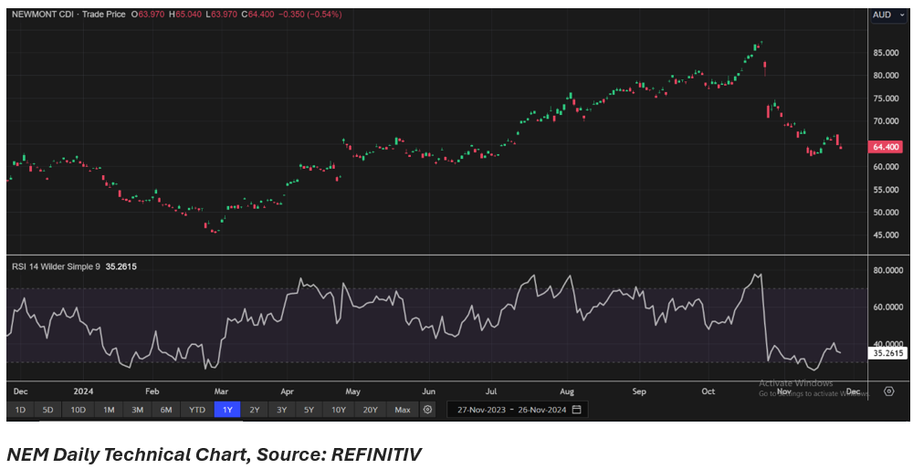 NEM shares closed 0.54% lower at AUD 64.40 apiece on 26 November 2024. Over the past one year, NEM’s share price has increased by almost 13.06%, while in the last three months, the share price has dropped by 16.08%.