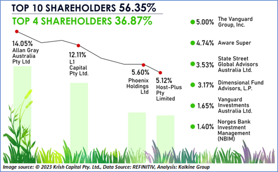 The top 10 shareholders of NUF hold approximately 56.35% of the shareholding in the company, while the top four shareholders together have a 36.87% stake in the company. Allan Gray Australia Pty Ltd and L1 Capital Pty Ltd have the highest stake in the firm, with a shareholding of ~14.05% and ~12.11%, respectively.