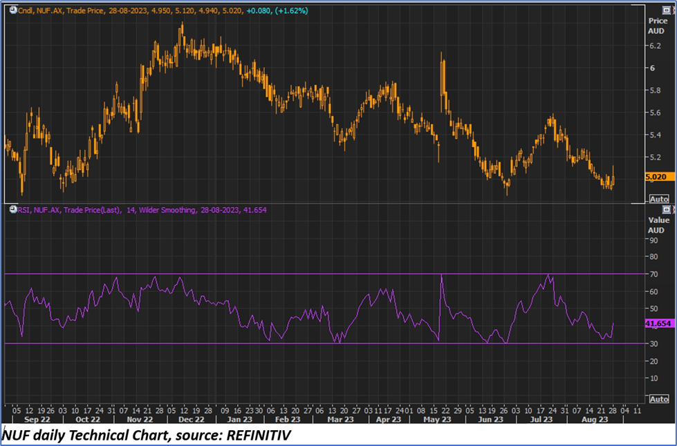 NUF shares closed 1.62% up at AUD 5.02 apiece on 28 August 2023. Including this gain, NUF's share price dropped by 16.75% in the last nine months and 12.69% in the past six months. Year-to-date fall is 18.10%.