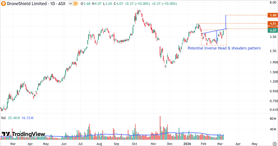 - On the daily chart, DroneShield is carving out a Potential Inverse Head and Shoulders pattern, a classic signal that the recent correction has found a floor. The price is currently charging toward a critical resistance zone at the $4.07-$4.25 neckline, backed by strong trading volume.