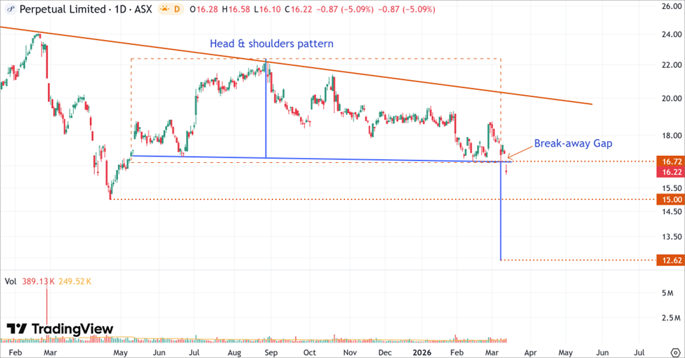 Perpetual Limited (ASX:PPT) is currently caught in a clear technical liquidity phase. Much like other rate-sensitive financials, the stock is being pressured by shifting monetary expectations and rising yields. The decisive move below $16.72 and the presence of a break-away gap confirm that the bearish outlook currently dominates.