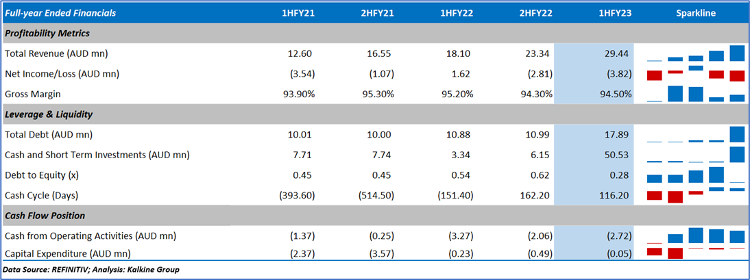 The company's stellar revenue growth has underpinned its stock performance. Its revenue has grown from AUD 5.99 million in FY18 to AUD 41.44 million in FY22, a CAGR of nearly 62%. Similarly, for the six months ended 31 December 2022, the company reported a revenue of AUD 29.22 million, 62.2% more than 1HFY22 revenue of AUD 18.2 million.