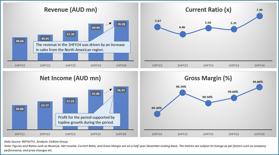 In the first half of the financial year 2024 (1HFY24), revenue of PME grew by around 32.88% YoY to AUD 76.26 million, backed by 36.8% YoY revenue growth in North America region. During the reported period, profit increased by 33.32% YoY to AUD 36.25 million, supported by topline growth during the period.