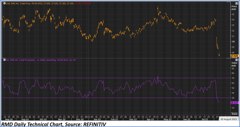 RMD shares closed 4.63% down at AUD 27.42 per share on 9 August 2023, with a market capitalisation of AUD 42.28 billion. Including today’s share performance, RMD’s share price dropped by 19.49% in the last 12 months and recorded a fall of 20.17% in the last one month.