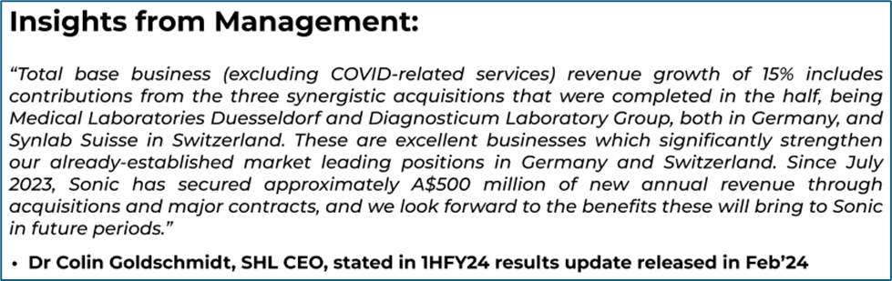 - 1HFY24, its base business revenue grew by 15% YoY to AUD 4,267 million