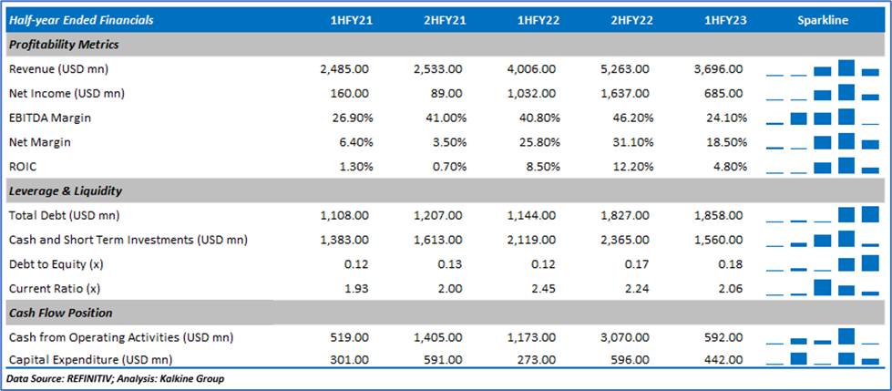 Unfavourable movement in commodity prices resulted in a 39.1% fall in underlying EBIT to USD 922 million and a 33.62% YoY fall in net profit after tax to USD 685 million.