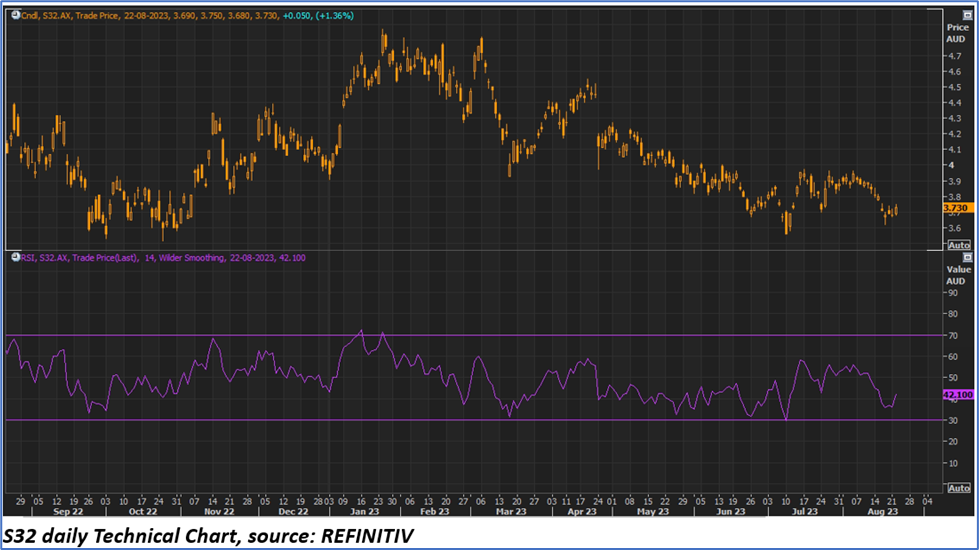 S32 shares closed 1.36% up at AUD 3.730 apiece on 22 August 2023 with a market capitalization of AUD 16.72 billion. With this, in the past 12 months, the share price has dropped by 9.83% and in the past six months, it has declined by 18.56%.