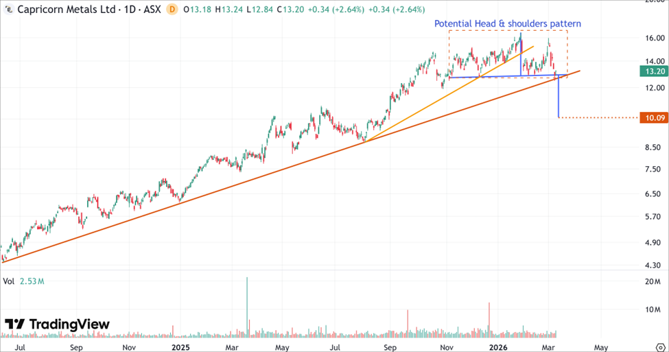 Both Capricorn Metals (ASX:CMM) and Perseus Mining (ASX:PRU) are experiencing a divergence between their fundamental "fortress" positions and emerging technical weakness. While their cash flow and balance sheets remain strong, the appearance of Head and Shoulders patterns on both daily charts serves as a critical warning. Investors should closely monitor the trendline support levels; failure to hold these key technical markers could lead to a significant short-term re-pricing toward their respective downward targets.