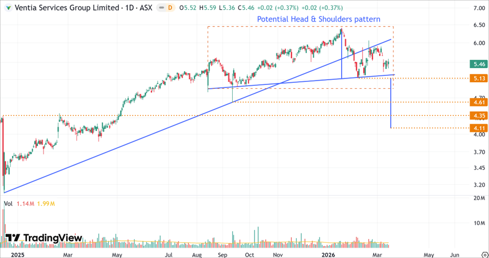 The technical chart for Ventia reveals a stock at a critical juncture as a potential Head and Shoulders pattern takes shape.