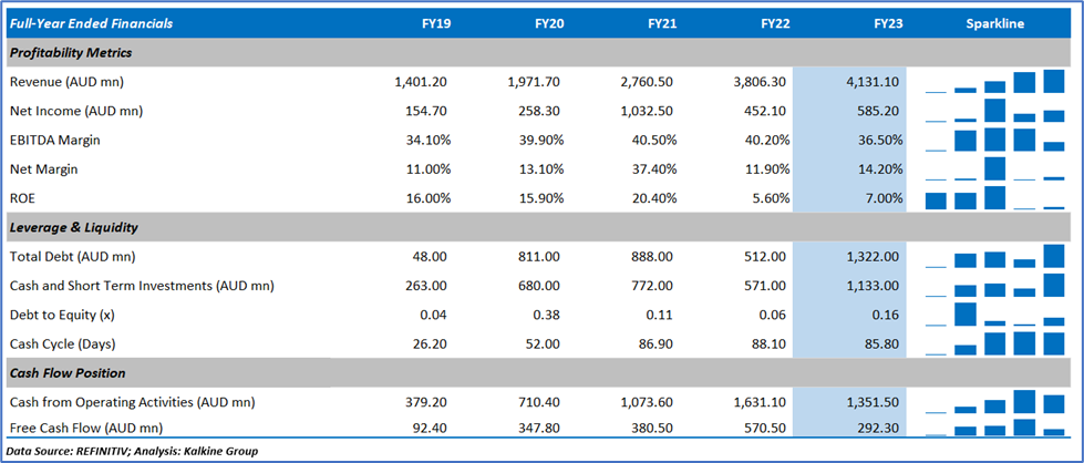 Revenue in FY23 was AUD 4,131 million, and underlying NPAT was AUD 301 million.