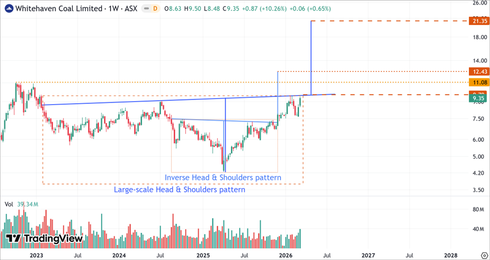The technical setup for Whitehaven has transitioned from a multi-year consolidation into a powerful, high-conviction breakout phase.