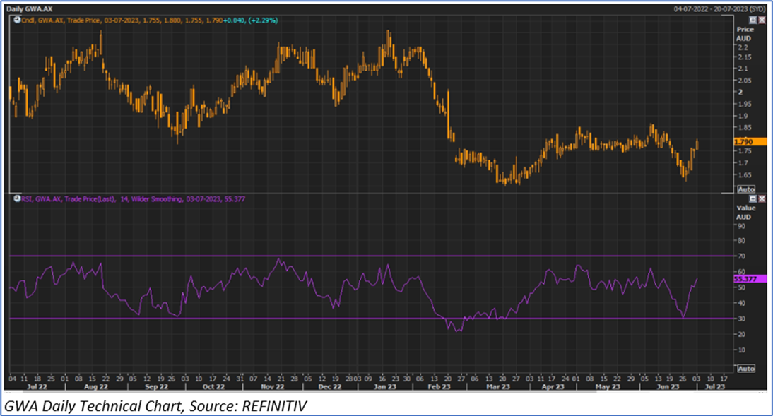 GWA shares closed 2.285% higher at AUD 1.790 apiece on Monday (3 July 2023). The stock price has gone down by nearly 1.82% in the last one month, and over the last six months, stock prices went down by around 14.68%. The stock has a 52-week low and 52-week high of AUD 1.600 and AUD 2.260, respectively, and is currently trading below the mid-range of the 52-week-high-low levels.