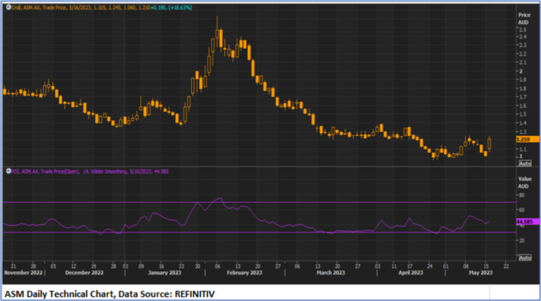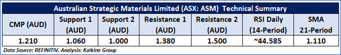 ASM share price started to move upside after taking support from a horizontal trendline. Moreover, RSI (14-period) is moving northward with a reading of 44.58, supporting a positive bias. However, prices are trading below the 21-period SMA, which may act as a resistance. Important support for the stock is positioned at AUD 1.06, while key resistance is placed at AUD 1.38.