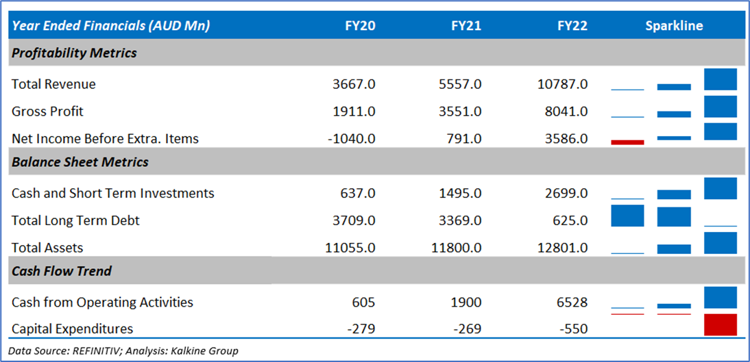 - In FY22, revenues of the company jumped by 95.19% to AUD 10.55 billion.